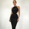 Sculpted and striking, this bodycon midi dress is designed to contour and captivate. Featuring a gold-tone chain detail at the neckline, it adds a touch of metallic edge to the sleek silhouette. Side cut-outs at the waist enhance the hourglass shape, while the open back delivers bold impact. A supportive string across the middle back ensures a secure fit without compromising style. Fully lined and made from a stretch-blend fabric, this dress offers comfort, structure, and confident coverage—perfect for evening occasions.
