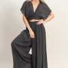 Elevate your wardrobe with this collared wrap top and wide-leg pants set, designed for effortless sophistication. Crafted from a soft cotton-blend fabric, it offers lightweight comfort with a smooth, fluid drape. The cropped wrap top features a structured collar that balances tailored detail with modern appeal. Flowing wide-leg pants create graceful movement, enhanced by soft pleats that add subtle dimension. The coordinated design delivers a seamless, polished look with minimal effort. Pair it with strappy sandals and delicate jewelry for a breezy, refined ensemble.