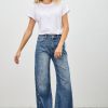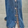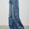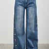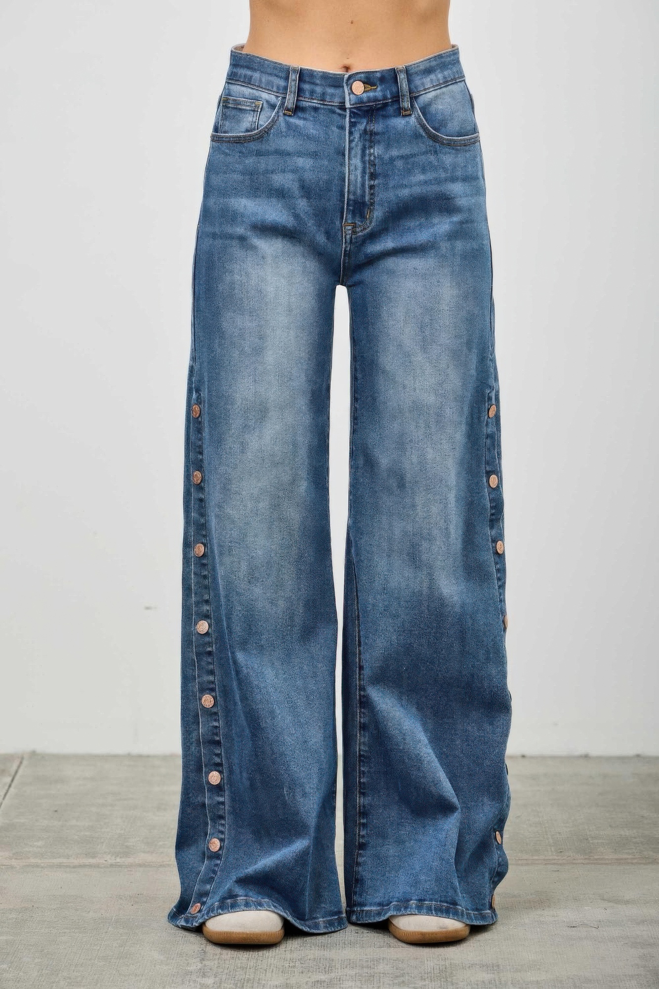Turn heads with these high-rise wide-leg jeans, featuring side slits accented by snap buttons for a bold, customizable finish. The wide-leg silhouette offers a flattering drape, while the high-rise waist defines your shape and elongates the legs. Crafted from a soft stretch denim blend, these jeans deliver both comfort and a clean, structured look. Snap button detailing along the side seams adds a modern twist and styling versatility. Finished with a zipper fly and classic 5-pocket design, this pair is perfect for elevating your denim game.