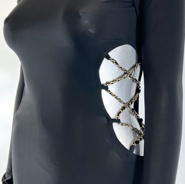 This long sleeve maxi dress blends refined structure with bold statement detailing. Designed with a high neckline, it creates a sleek and sophisticated silhouette. The side bodycon fit contours the figure, enhancing natural curves with a smooth, sculpted finish. Chain detailing along the side adds a striking accent that elevates the overall design. Crafted from a comfortable stretch blend, this maxi dress is ideal for formal evenings and standout occasions.