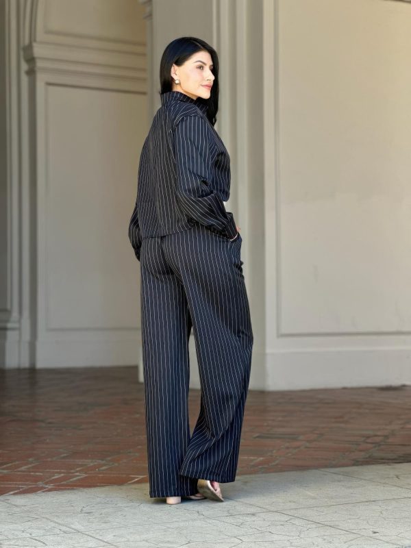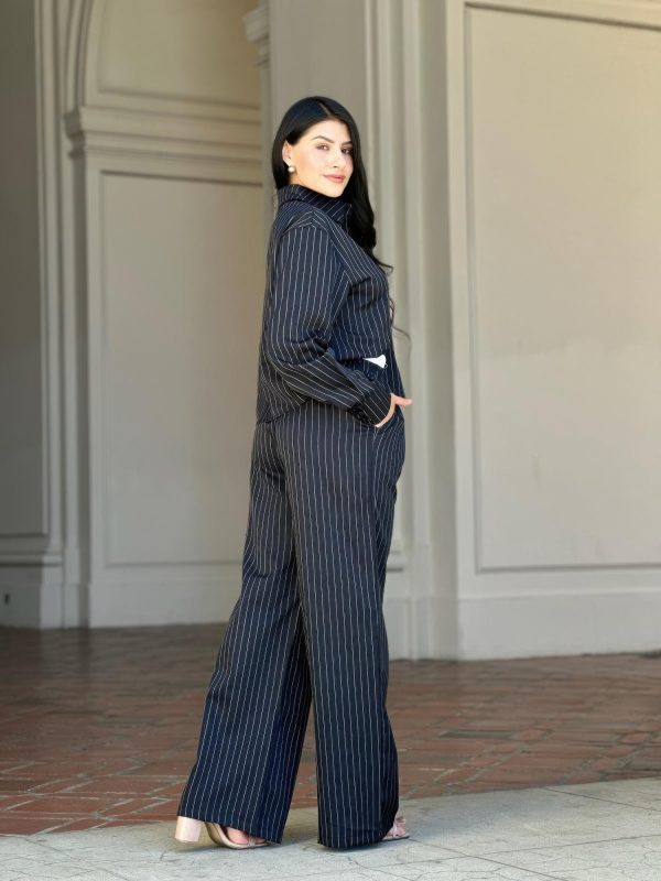 Sophisticated yet relaxed, this striped set with double waistband pants and top offers the perfect balance of structure and comfort. The collared button-down shirt features adjustable sleeves for versatile styling, while the contrast double elastic waistband pants ensure a flattering and flexible fit. Designed with a sleek straight leg silhouette, this coordinated set delivers effortless polish whether worn together or styled separately. Ideal for workdays, brunches, or travel-ready looks that keep you chic and comfortable.