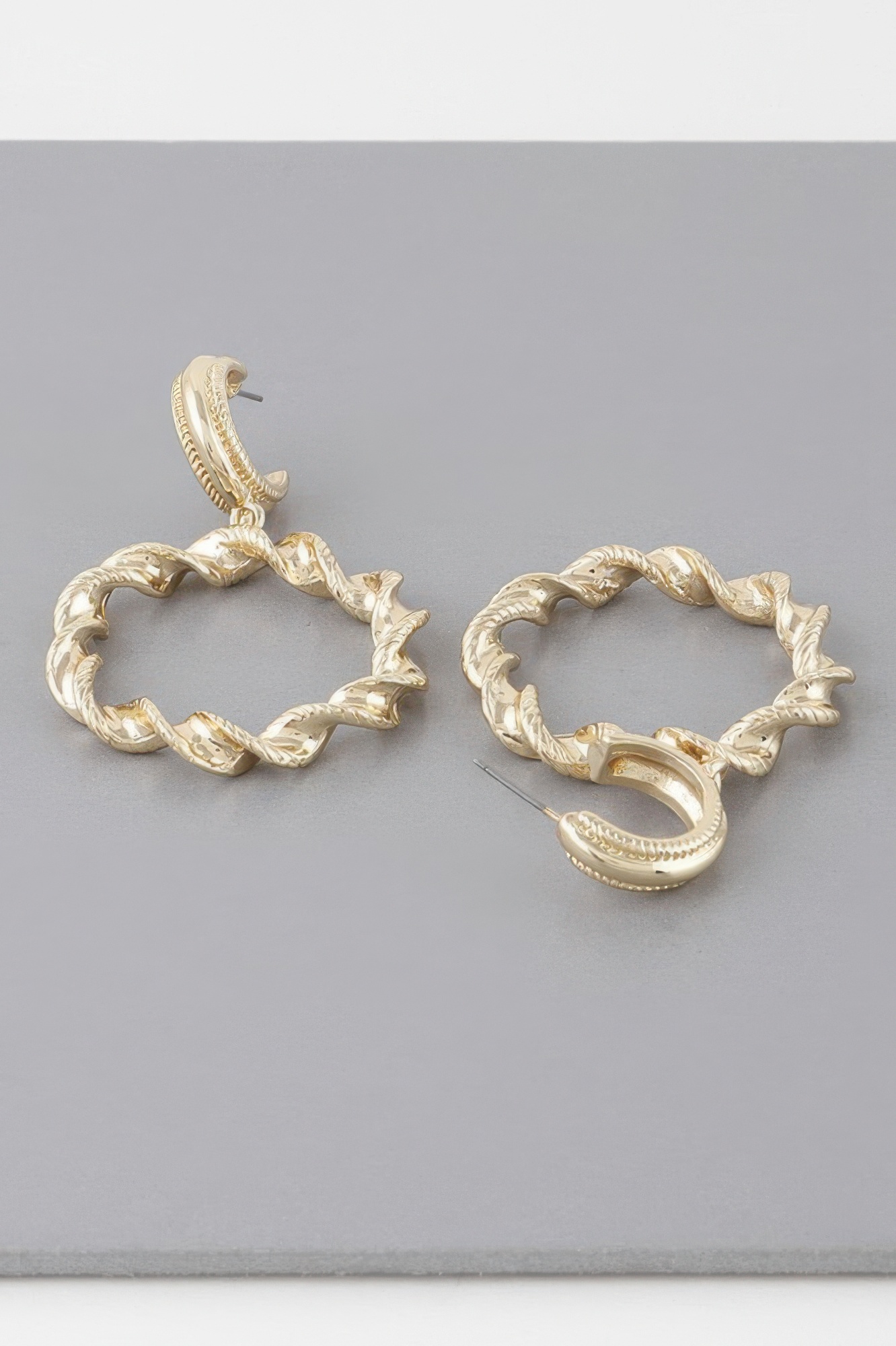 Add effortless edge to your look with the Twisted Hoop Drop Earrings. These earrings feature a twisted metal design that creates texture and movement in a refined silhouette. The elongated drop shape flatters the neckline and makes a subtle yet confident statement. With a medium size and lightweight build, they’re perfect for all-day wear. The polished finish enhances their sculptural feel while remaining versatile enough for both casual and elevated outfits. They’re ideal for adding dimension to your accessories without overwhelming your look. A modern take on classic hoops, they’ll quickly become a go-to favorite.